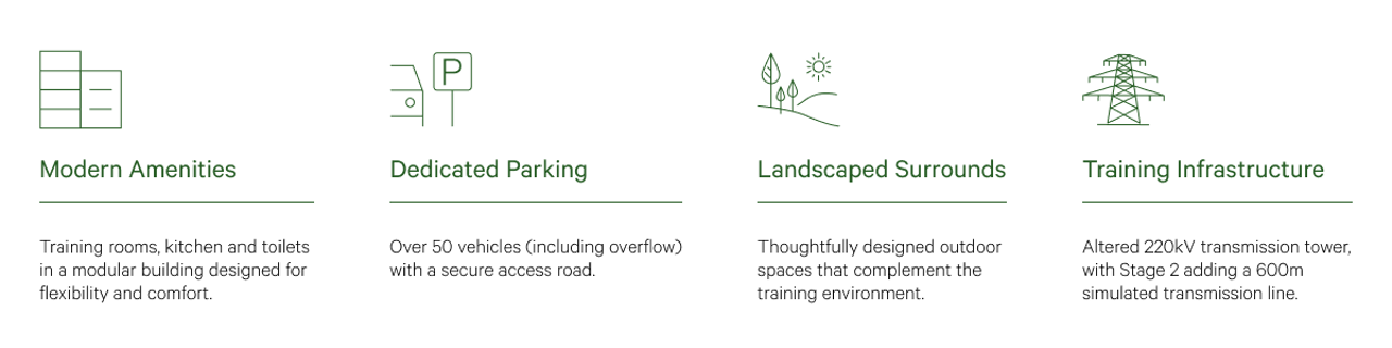 The Wagga Energy Training Hub provides a comprehensive range of facilities designed for practical training and user comfort. Inside, the Hub features two large training rooms, one smaller training room, a private meeting room, a fully equipped kitchen, and accessible toilets. Outside, the Hub includes landscaped surrounds, a dedicated access road, hardstand areas, secure parking, and storage shed. For hands-on training, the site offers an altered 220kV transmission tower, with a proposed Stage two addition of a 600m simulated transmission line to replicate real-world conditions in a safe, controlled environment.