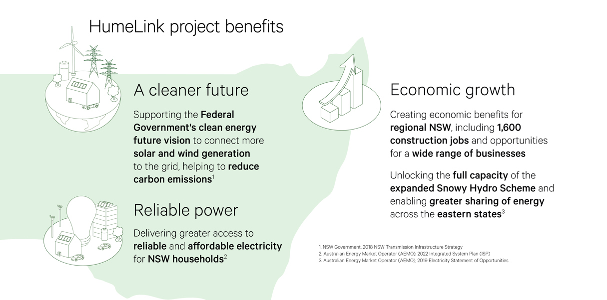 To meet our future energy demands, Australia needs to transition to a greater mix of low-emission renewable energy sources, such as wind and solar. HumeLink will deliver a more reliable and more sustainable grid by increasing the amount of renewable energy that can be delivered across the national electricity grid, helping to transition Australia to a low carbon future.