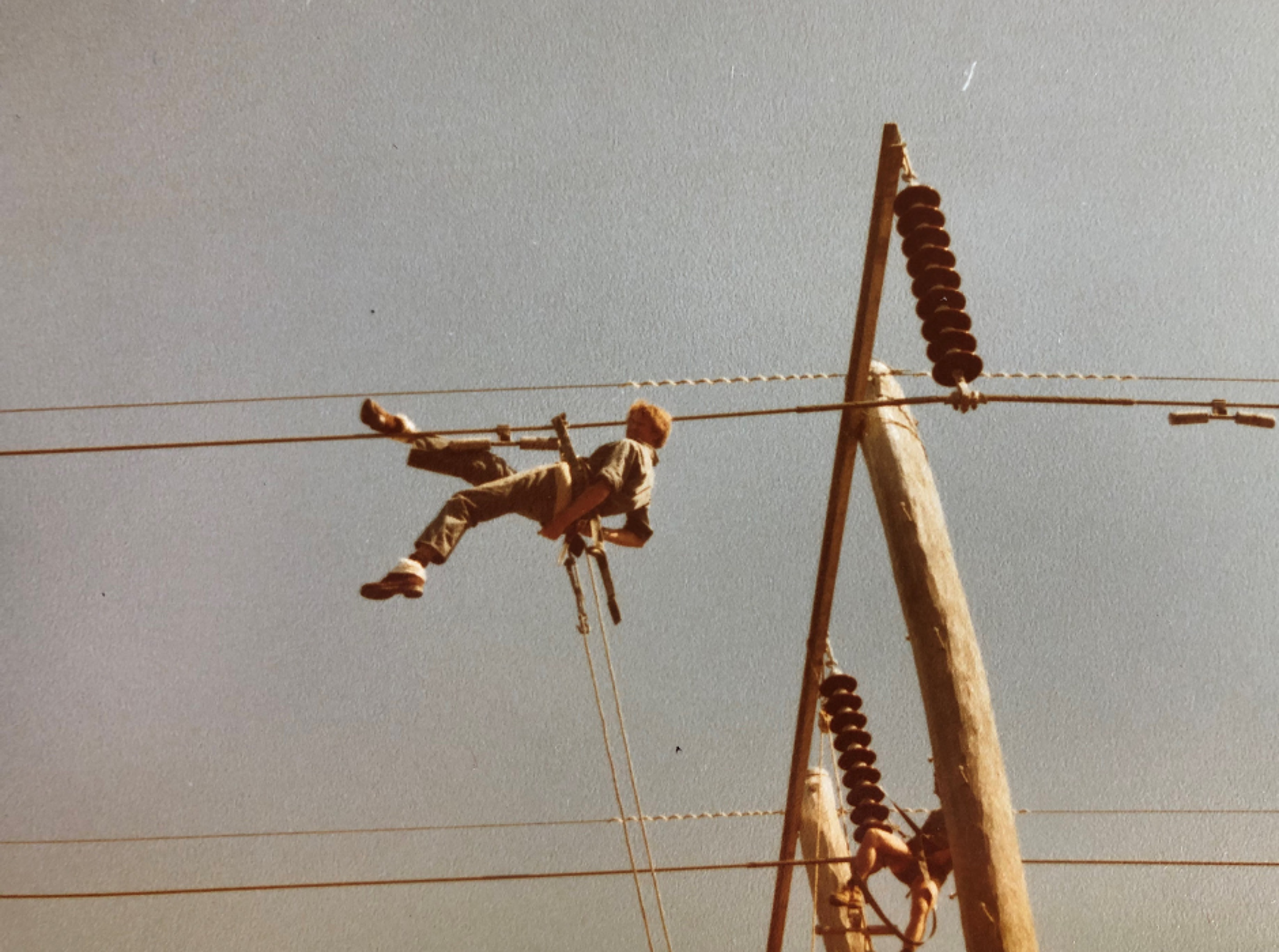 His technical expertise spans substations, voltage transformers, tree lopping on easements, and even explosives work. “Blasting guy holes and tower footings was probably one of the more dangerous jobs. We held multiple tickets because of the wide range of work we did.”
