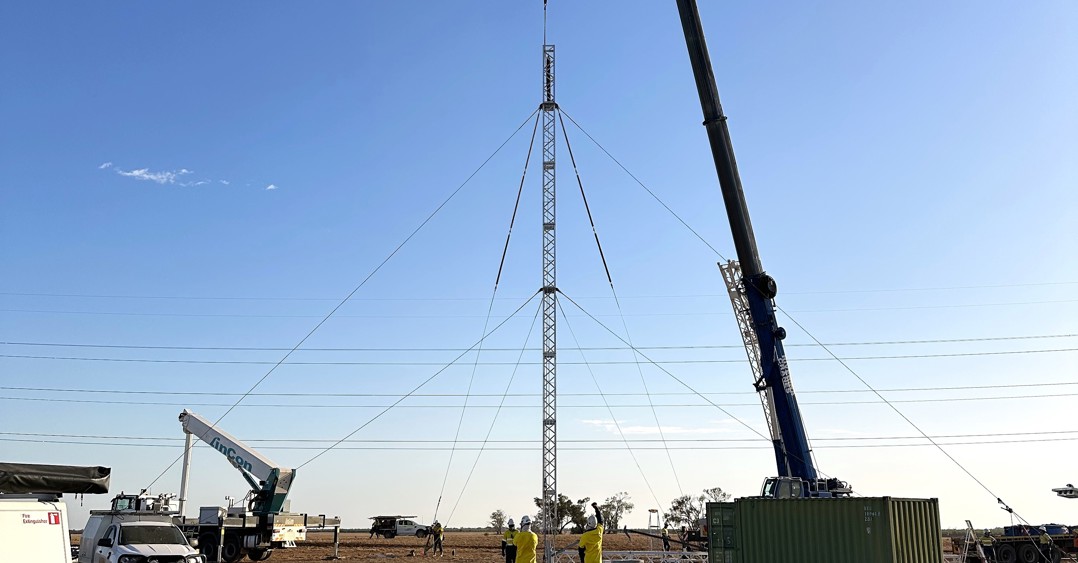 Specialist crews have successfully lifted into place the first of six towers near Balranald, as a major reconstruction effort continues at pace to repair a 2km section of transmission line damaged by a significant storm event.